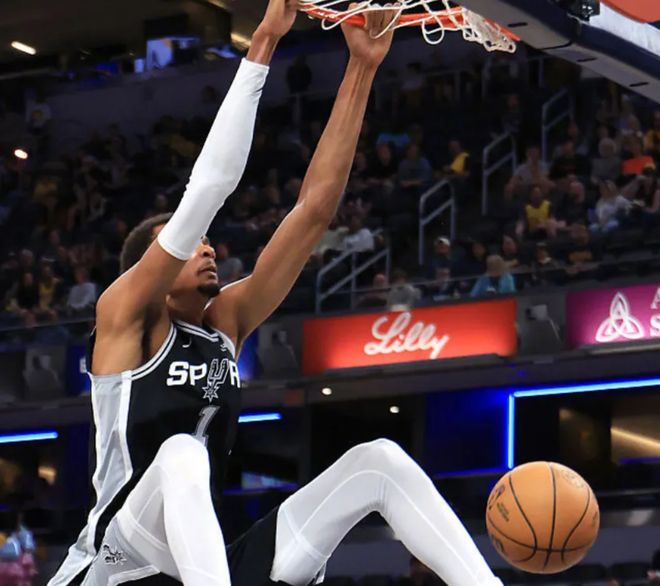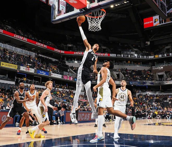 果不其然,文班亚马的对抗能力提升了不少,他在这一场比赛里多次撞开面前防守的步行者队球员,还上演了奥尼尔式的双手扣篮,力量十足。在个人技巧方面,文班亚马也是保持了出色的能力,在三分线外3投2中,还有非常精彩的持球攻,如入无人之境。